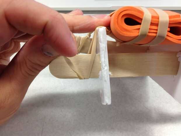 Lugar el abrigo de la espuma con el huevo encima de la base. Tome cada uno de los cuatro extremos de las cadenas de Margarita y envuélvalos alrededor de los extremos de los palillos del popsicle, doblando hacia atrás sobre ellos si es necesario para asegurar un ajuste preciso ajuste.