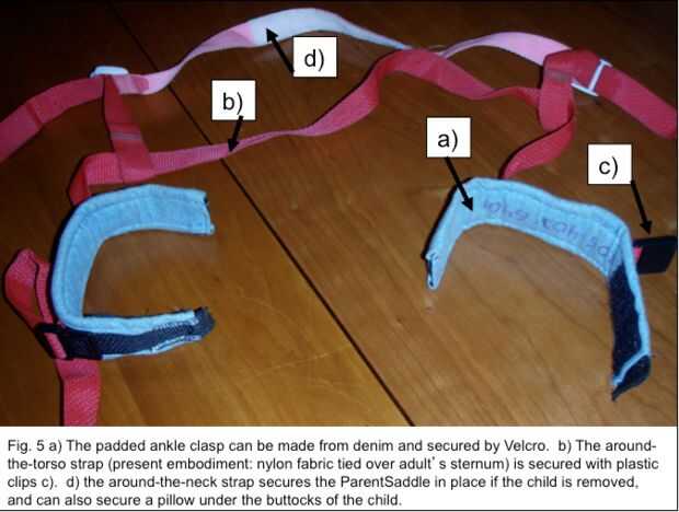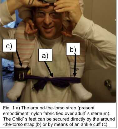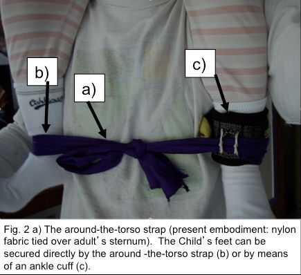 Uno a sí mismo como puedes ver en la figura 1, se hará solo una correa, pero el pie puede resbalar hacia fuera y puede lastimar el pie, así que podría usar algún relleno como en algunas de las figuras anteriores. Sería mejor usar algo un poco elástica para el "alrededor de la correa del pecho" porque entonces puede ser bastante ajustado en el padre, pero todavía le permiten tomar respiraciones profundas. Entonces usted puede encontrar una manera de conectar el pie del niño en la correa.