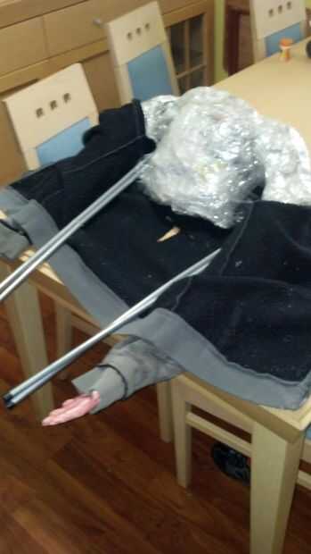 Para hacerlo, tuve que crear un torso falso, esto fue hecha usando una técnica llamada escultura de cinta, en que cinta alrededor alguien ha cuerpo luego recortas, esencialmente haciendo un reparto de ellos. Luego grabó dos manos falsas a los extremos de los brazos y añade un marco para que sea más fácil de transportar. Los dos tubos de metal irá más adelante dentro de mis bolsillos de los pantalones para sostenerlo para arriba. Una chaqueta vieja fue agregada para cubrir el torso, y se realiza un orificio a mitad de camino en la espalda, por mi cuerpo entrar.