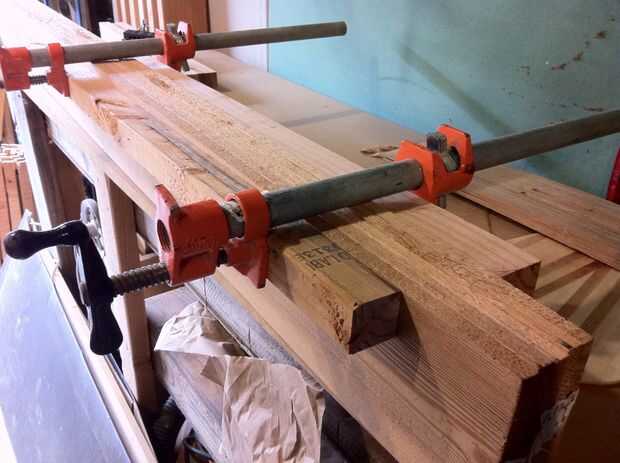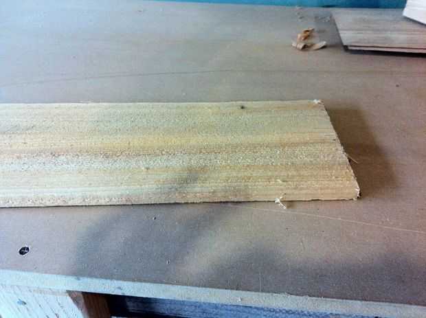 Se reúnen suficientes tablas para formar una junta que es un poco más gruesa que las barras será. He usado 5-6 piezas 1/2 en espesor para hacer una viga sobre 2,5 en x 5 pulg (que será rip esta en dos barras transversales más adelante)