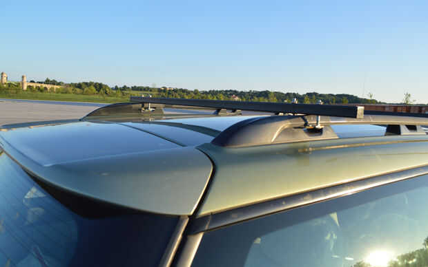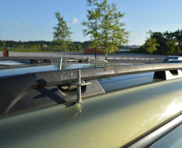 Junto con los soportes del pasador de horquilla, inserte el perno a través de la parte inferior del soporte y a través del metal en ambos lados. Inserte la tuerca sobre el perno y apriete a los carriles de coche con una llave de tubo de 1/2".