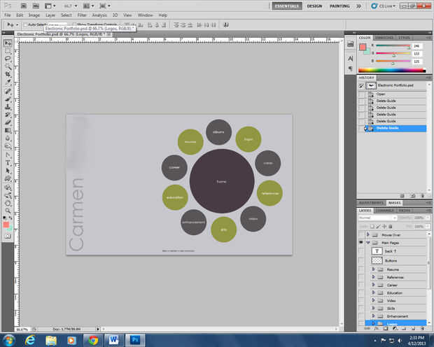 En primer lugar, diseñé la página en Adobe Photoshop. He creado el diseño del círculo que se utilizaría a lo largo de la totalidad de la cartera, luego agrega mi nombre en el lado izquierdo y un derecho de autor en la parte inferior. He hecho distintas capas para cada uno de los círculos para que pudieran convertirse en botones más tarde.