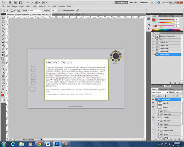 , investigué información sobre diseño gráfico, ya que es el negocio espero entrar una vez que me gradúe. He escrito a toda la información utilizando el formato de escritura que mis profesores me enseñaron, asegurándose de incluir referencias para que no plagiar. También debían incluir otra información sobre mi formación y las cosas extras que había aprendido que relacionadas con mi profesión. Una vez más, he hecho estos en grupos de diferentes capas para que pudieran convertirse en páginas separadas.