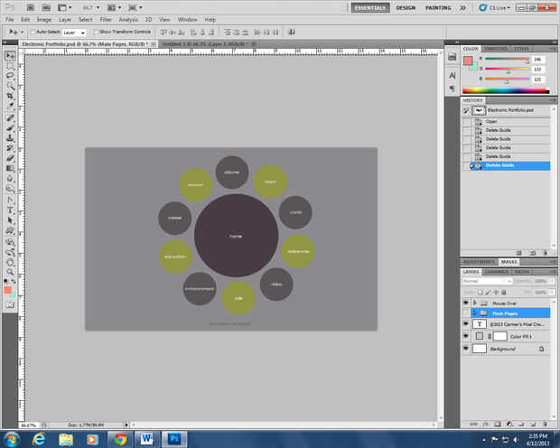 En la parte final de mi diseño Photoshop, creé un ratón sobre la página. He utilizado los botones del círculo que había utilizado en la Página principal y poner sobre un fondo gris más oscuro. Esto fue creado para que los espectadores podrían puntero del ratón sobre el diseño del pequeño círculo en otras páginas, y que iría a esta página. Desde esta página, puede visitar cualquiera de las otras páginas en mi portafolio electrónico.