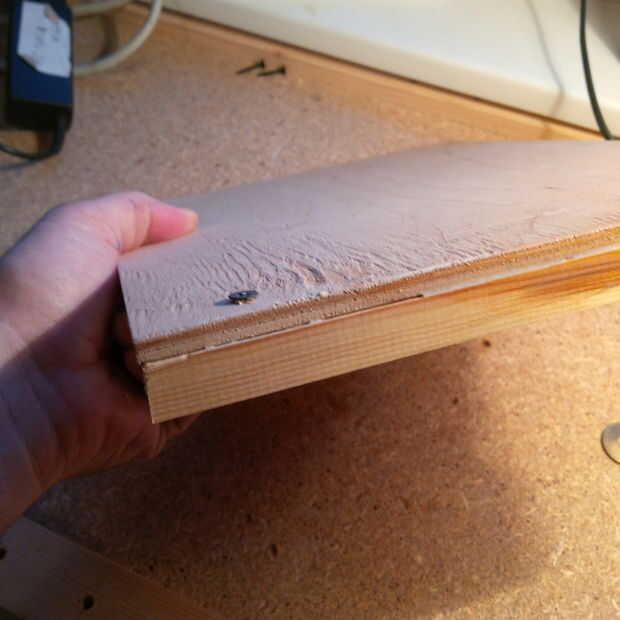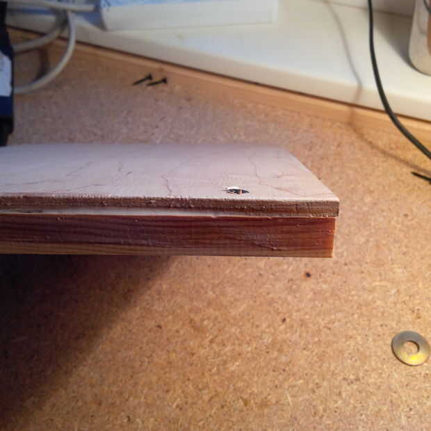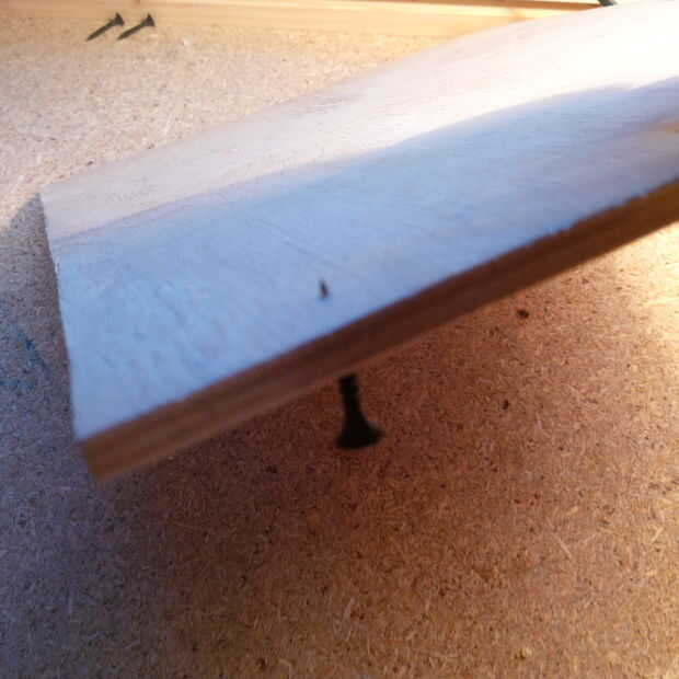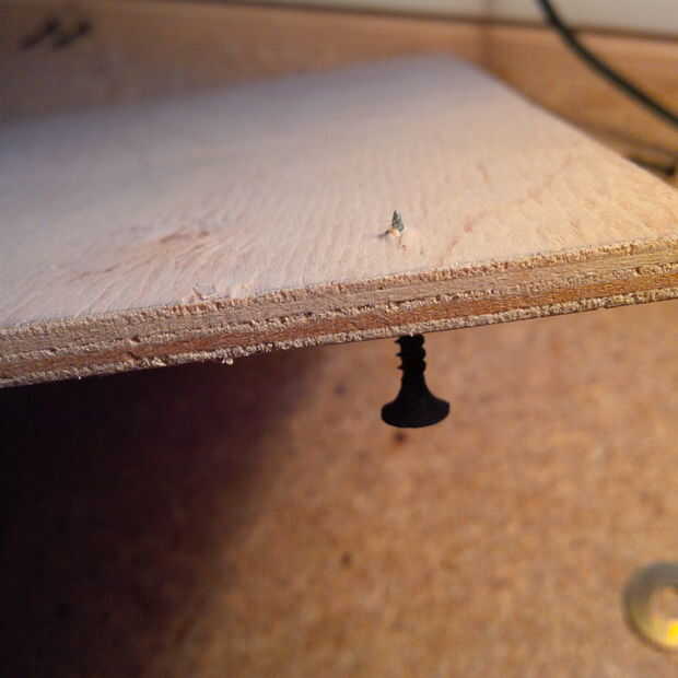 Pongo los tornillos a través de la madera en la parte superior de la Junta de tablón grande/tamaño de papel hasta la punta peeked|peaked :) a través. Esto lo hice luego pude bang las puntas de tornillo en el soporte del tablero que voy a adjuntar.