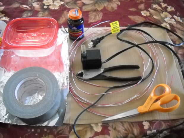 Papel de aluminio Un recipiente de plástico Cinta para ductos Pegamento Alambre Una bomba de Cortadores de alambre Tijeras Cartón Una bolsa de plástico Puntos de espuma