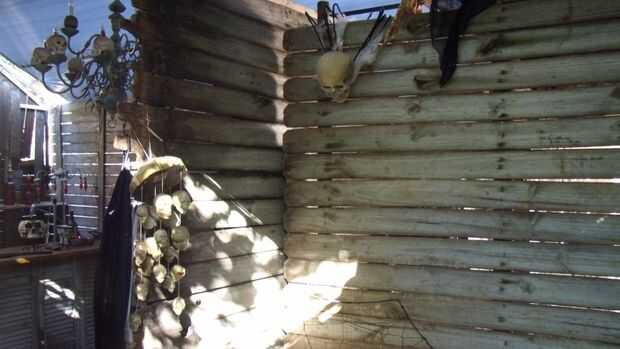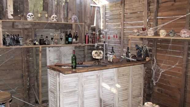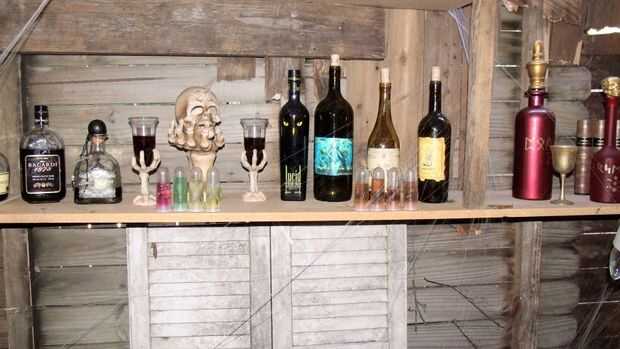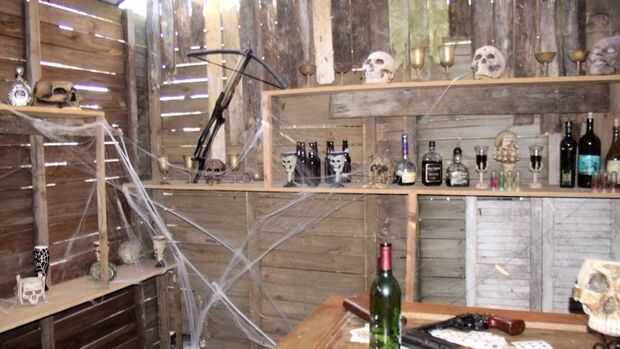 Al salir del túnel portal usted gire a la izquierda y entra en la habitación de salón, las paredes están cerca de la aislamiento se volvió del lado de la Cruz cobertizo portátil montado sobre soportes de 4 x 4", la barra está hecha de puertas de armario abatible y puerta de interior, es nuestro carro de salón borracho le da instrucciones contradictorias sobre cómo sobrevivir y una"palabra segura"... nadie atrapado en eso la palabra de seguridad acaba de hacer los actores concentrarse más en usted. Hemos tenido gente gritando pollo frito, aguacate o ladrar como perros en mi caras de actores... es el precio. Muchas de las botellas son deportivas etiquetas creamos y varios tenían caseras "tapones"