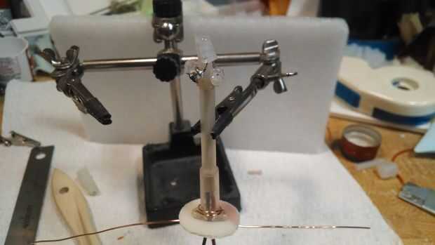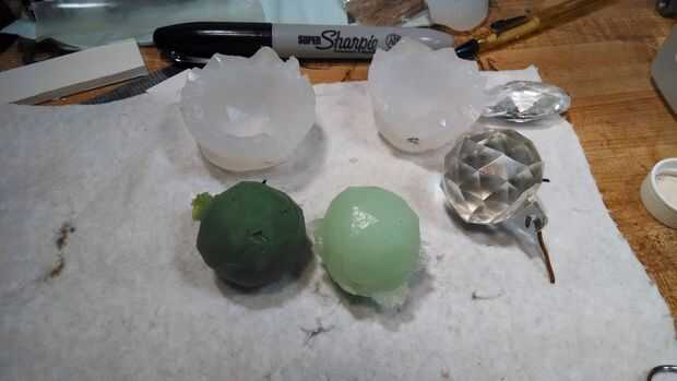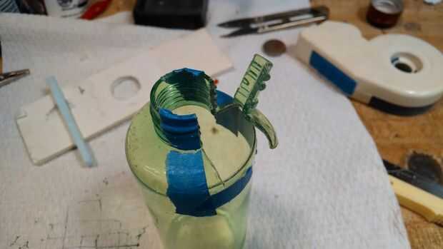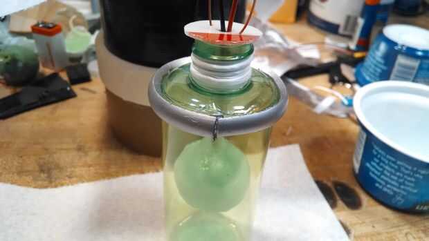 Hice el cristal de la primera moldura un redondo sol-catcher en oogoo, aunque una pelota de golf o cualquier cosa redonda probablemente funcionará. Completamente rodeado de oogoo y me cortan un patrón de zig-zag alrededor de él para ayudar a alinear el molde más adelante. Realmente solía oogoo coloreado con colorante alimentario verde para hacer el cristal. He usado aceite vegetal regular, como lo que se usaría para cocinar, como un desmoldante, que funcionó muy bien en la prevención de la silicona se pegue al molde (silicona normalmente se pegará a sí mismo). Probablemente no es la mejor práctica, pero funcionó. I había cableado 3 leds en serie y funcionó los cables por un tubo de plástico transparente que reclama de una pluma. Esto fue todo puesto en un recipiente de plástico boca abajo verde de viajes para shampoo o lo que sea, que era entonces hotglued el cuerpo de la pistola. Para formar el cuello de la botella, corté un palo de pegamento caliente en cuartos longitudinalmente y envueltos que alrededor de la botella se pasa por el tablero de cartón pluma y luego pintado.