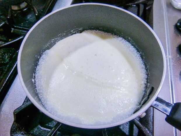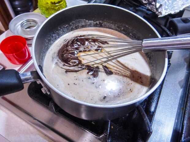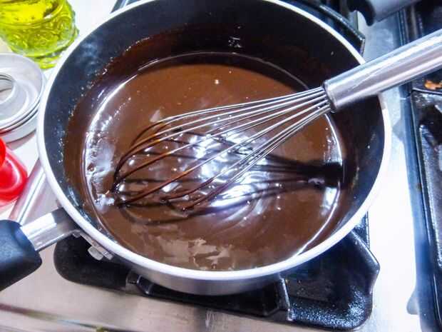Mientras está horneando el pastel, poner el azúcar en polvo, crema, pesado y una pizca de sal a hervir en una olla en la estufa. Apagar y retirar del fuego y vierta en los chips de chocolate. Dejar reposar un minuto o dos y luego batir hasta que se mezcle completamente. Enfriar en el refrigerador durante al menos dos horas. Sacar la tarta del horno y dejar para enfriar en el refrigerador mientras comienzas el siguiente nivel: masa de tarta.