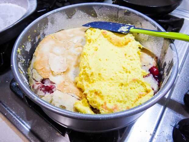 Aplique una capa de masa para cubrir la parte inferior de cada pan. Transferir cuidadosamente el pastel en el molde de pastel de primavera forma. Cubrir la tarta con más masa, doblándola hacia abajo y alrededor de los bordes para sellar el interior. Distribuir lo que queda de la mezcla entre las dos sartenes.