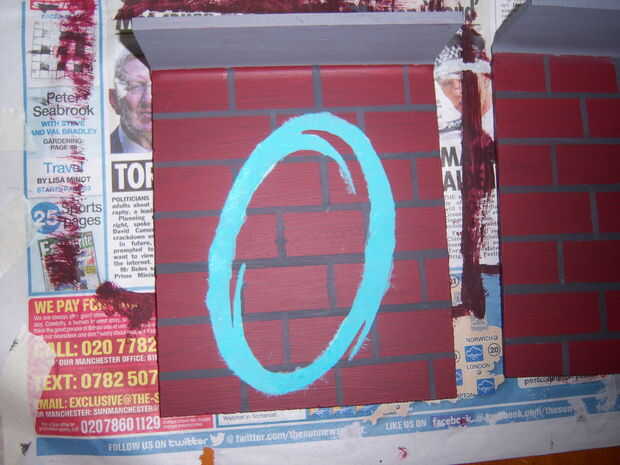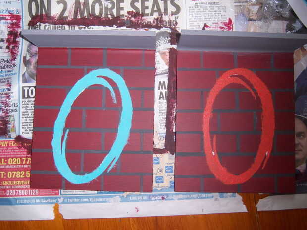 Ahora que tiene una pared de ladrillos puede pintar en el portal. Ahora usted puede recortar la plantilla portal que usted debe haber impreso anteriormente. Asegúrese de que usted corte sólo la parte que desea pintar (ver cuadro). Alinee la plantilla como se ve en la foto y luego pintar sobre ella con luz azul en uno y naranja por otro. Te recomiendo darle 2 o 3 capas. una vez que la pintura se seca, retire la plantilla y debe dejarse con un portal de aspecto agradable.
