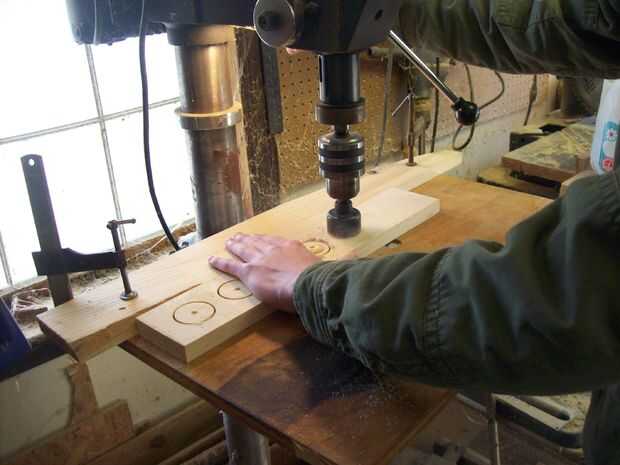 Esto es paso variará de un montón de gente. Todo depende qué brocas usted tener a la mano o cuánto dinero estás dispuesto a gastar en él. Me perforó los agujeros con un poco de BI-metal de 1 3/4" luego les encamina hacia fuera con el router de mano. Si tienes un pedacito de Forstner hará todo más fácil. Lamentablemente mi router rompió justo después de termine de limpiar los agujeros. Se necesita 6 agujeros. A partir de la medida final de cada 2 7/16" hacia abajo en el centro (1 1/2"). Cada agujero es perforado 1/4" de profundidad.