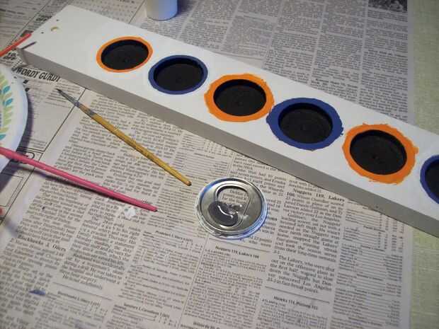 El último paso antes del montaje. Esto es opcional si no quieres que sea Portal temático pero necesita pintura / grabado / pegamento en los números 1-6 en el tablero. Aerosol pintado de todos lo mate piezas blanco. Luego pinté el interior del negro de los orificios y el exterior naranja o azul para los portales. Esto es donde puede recargar la soda entra en juego. A menos que tenga una plantilla de algún tipo tendrá algo para trazar. El anillo superior de la soda da el ancho perfecto para los círculos de colores alrededor de los orificios. me áspero trazos a mano alzada luego utiliza el puede saber qué se va a tapar con pintura blanca. El hoyuelo donde estaba la ficha es el centro de la lata así alinearse con la marca de los agujeros.