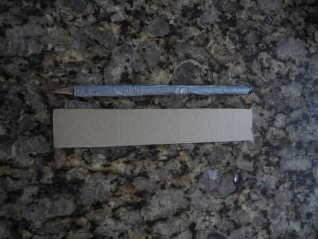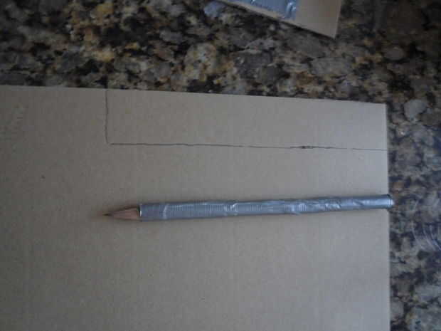 Ahora que listo con la envoltura tienes que cortar el cartón para reforzar la parte que se harán los agujeros. Primero dibuja un rectángulo que es 7 1/2 pulgadas de largo y 1 1/2 pulgadas de ancho. Estas medidas son para un lápiz nuevo. Una vez que haya movimiento de corte en el siguiente paso.
