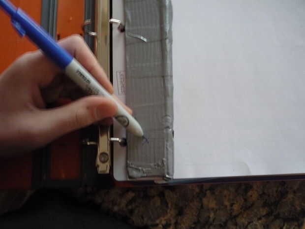 Para hacer los agujeros para los anillos, usted necesita marcar los lugares donde van. Poner el cubilete del conducto cinta junto a los anillos en una carpeta. Ahora marca los puntos al lado de los anillos donde van los agujeros. Corte ahora a lo largo de las líneas de la "x" que usted acaba de hacer. Una vez que usted es un lápiz y empujar el lápiz a través del corte que acaba de hacer. Ahora listo!