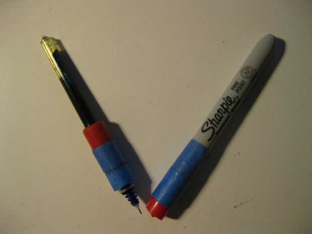 sección de tubo de 1"+ imanes de neodimio + llamas pistola azul = un portalápices impresionante.Yo solía hacerlos "en carpeta" portalápices de cartón de papel usado toalla rollos. Ahora que mi hijo está entrando en 3 º grado pensé que me ma