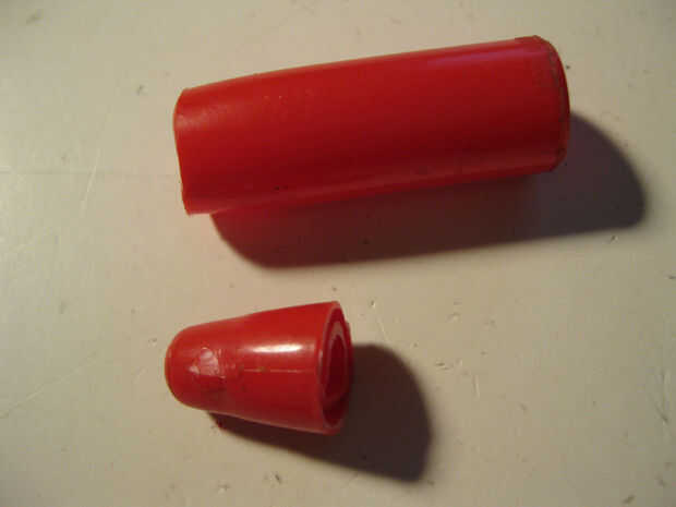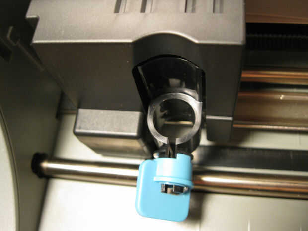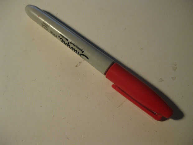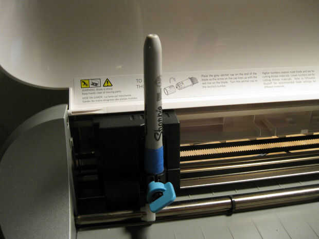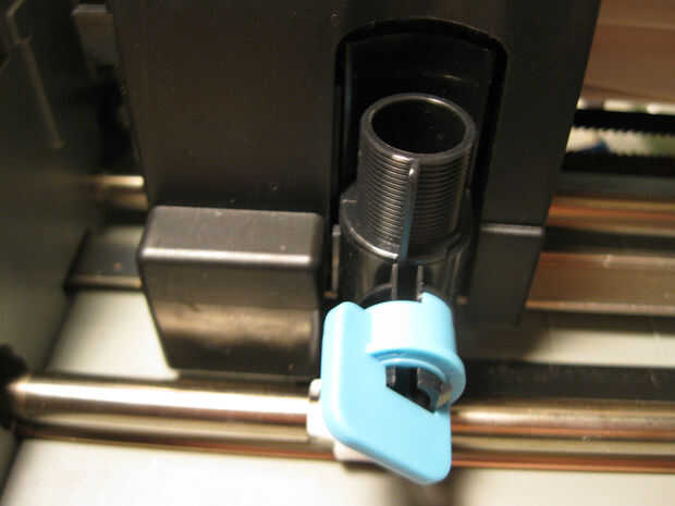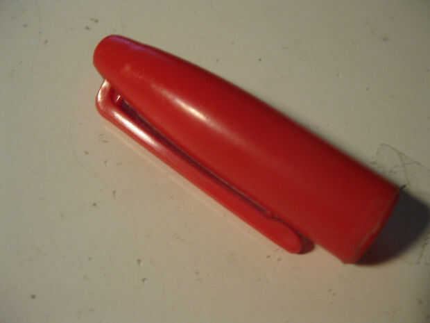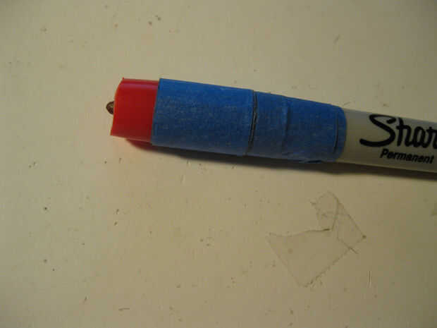 Después de probar diferentes cosas de mi escritorio descubrí que una tapa de Sharpie era casi del tamaño correcto. Había recortado para que la punta de la pluma pegada hacia fuera más allá del borde de la tapa. Cortar el clip de la tapa de la pluma. Cortar la punta de la tapa de quita el aro interior que sostiene firmemente en la pluma, así que la pluma tenía que ser pegadas a la tapa para permanecer en el lugar. Envuelve también la tapa con suficiente cinta para que se ajuste cómodamente en el sujetador de la cuchilla.