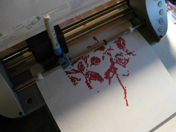Cargué un pedazo de papel en la almohadilla de corte e hizo una prueba para ajustar la altura de la pluma. Esto fue bastante fácil. El ajuste adecuado borra el papel en el ajuste superior y toca ligeramente el papel hacia abajo. Después se ajustó la altura de la pluma que era tiempo de tratar de una imagen. Utilicé los tres perro cabeza basado en mi amigo mono el perro de la ciencia. Puesto que esta imagen no iba a recortar que no requiere ningún tratamiento previo. Sólo importados el JPEG y había trazado en el programa de estudio de la silueta. Hice el primer 'impresión' a una velocidad bastante lenta, pero las versiones posteriores salieron bellas a toda velocidad.