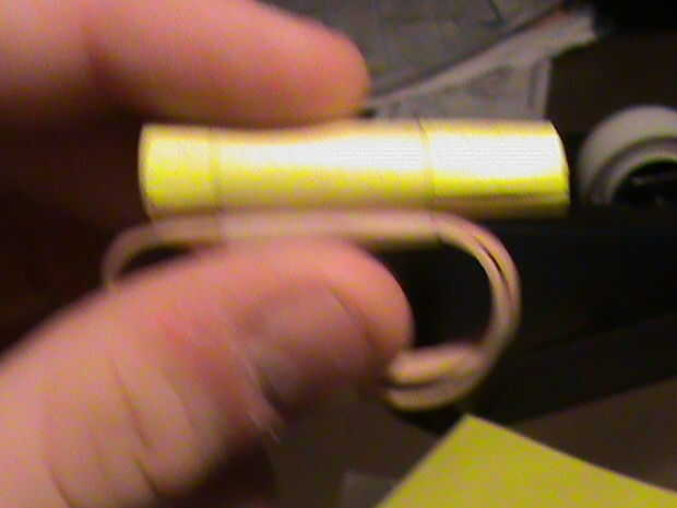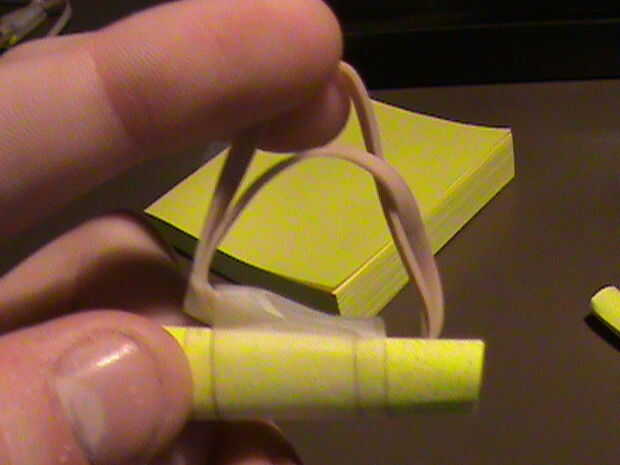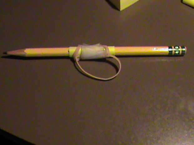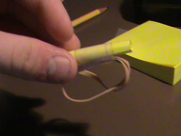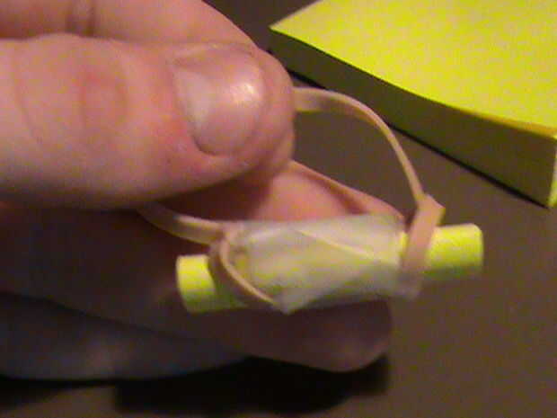 Tome la goma y el tubo. Localizar donde se grabó inicialmente la goma. Coloque la cinta alrededor de ella y tubo aquí. Luego tomar un lazos de goma y cinta adhesiva en el tubo. Permitir que el otro colgar libremente. Que esto Envuelva alrededor de la oreja e inserte el untencil de elección. (Sólo utilizar un bucle porque dos lazos está demasiado apretado y duele!)