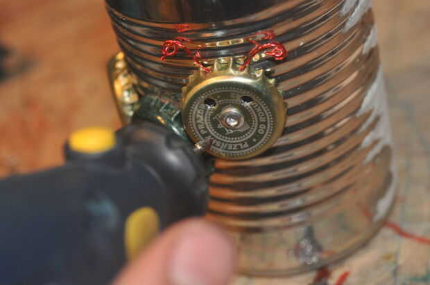 Remache ahora la última tapa de la botella ligeramente por encima, pero todavía unido a los demás. El remache hace una buena nariz, y para los ojos sólo puede perforar dos agujeros. Para la boca, utilice la broca cónica para grabar una sonrisa en la tapa de la botella. O, usted podría cortar una sonrisa, pero quería practicar con mi Dremel.