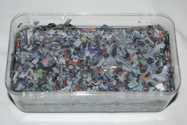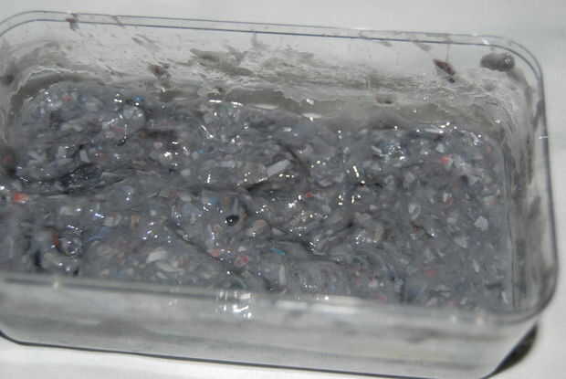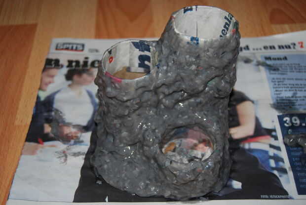 -Corte thepieces de periódico en trozos pequeños de papel. Coloca el pequeño pedazo de papel en un recipiente y mezclar con agua (también se puede hacer con una batidora). Cuando usted tiene un pasado de agua y papel puedes poner algunos fondos del polvo en la mezcla y esto agitar durante un minuto. Ahora tienes una mezcla agradable para poner en el cubilete.