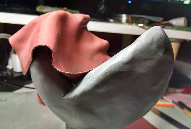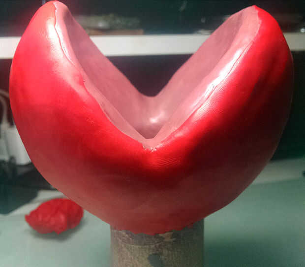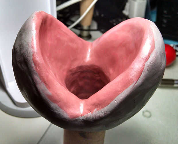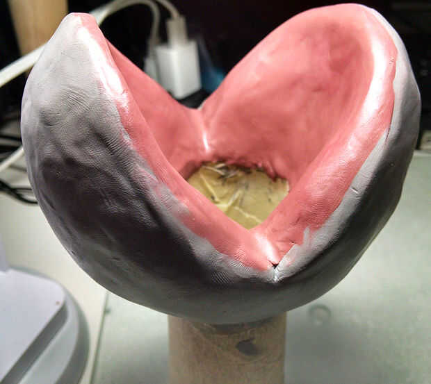 Estirar una hoja fina de una arcilla de color rosa grisácea y colóquela suavemente en el interior y la forma para adaptarse a. Corte el exceso y suavizar contra la arcilla de relleno. Una vez más, tenga cuidado con las burbujas de aire. Si usted consigue algunas, haga un orificio con la punta de su cuchillo y suavizar el aire y luego suave sobre el agujero para borrarlo. Asegúrese de que la arcilla viene al menos la mitad de los labios y el abierto del tubo.