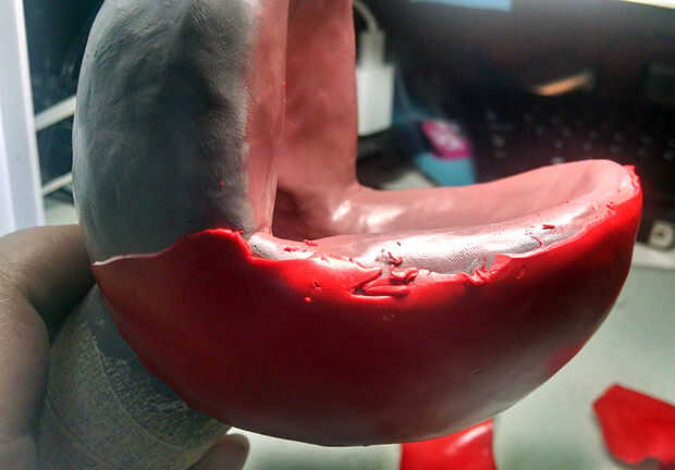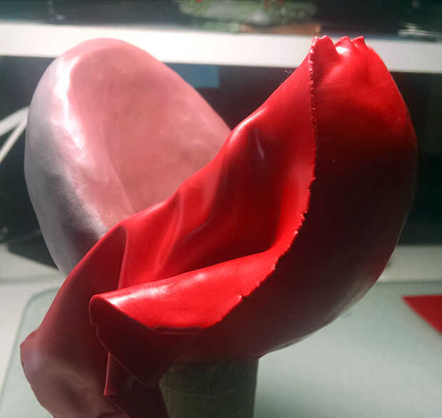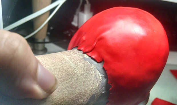 Ahora hacer lo mismo con una hoja fina de color rojo. Debe cumplir el grisáceo color de rosa y el final donde se unen el tubo y bola. Otra vez, si es grumosa o hay burbujas de aire, suavizarlos con sus dedos y la presión. Tratar de suavizar y limitar tanto como sea posible de las huellas dactilares. No es vital, pero es menos a corregir más adelante.