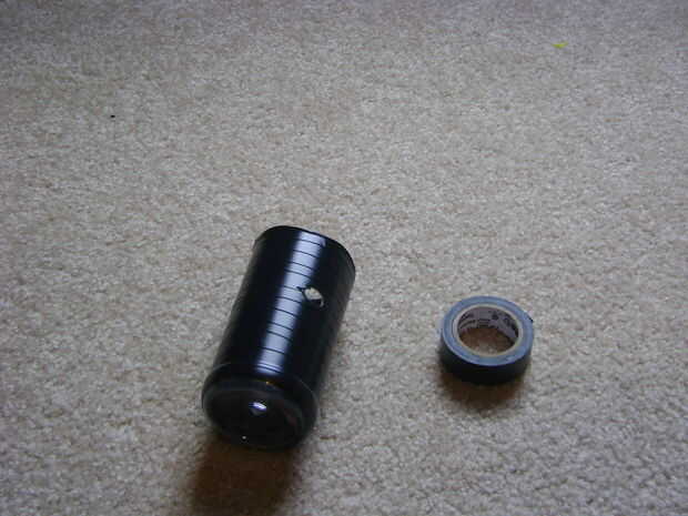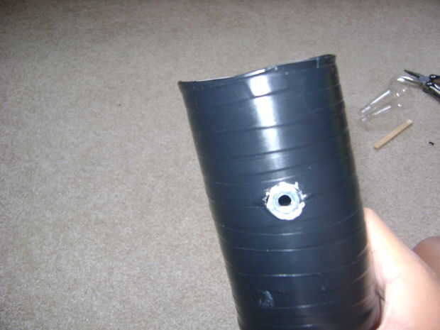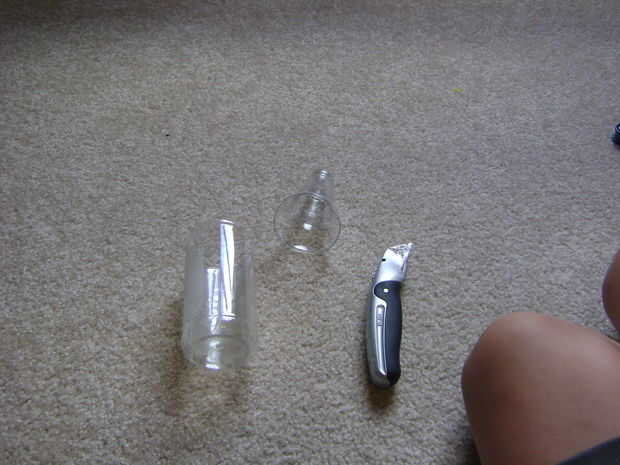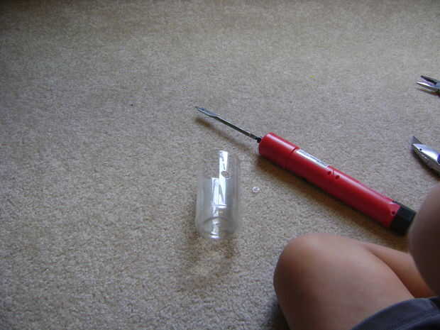 Simplemente el corte de la parte superior con un cuchillo. Luego perfore un agujero en el centro de la cara. (el tamaño de uno de los frutos secos) Cinta alrededor de la botella para ocultar la claridad de la botella. (puede la cinta sobre el agujero y a empujar hacia fuera la cinta delante del agujero). Luego poner pegamento alrededor del borde de una de las tuercas y pegamento en el agujero.