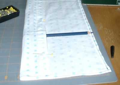 Elegí un doblez de 2-1/2 pulgada como un compromiso... yo realmente debo ha elegido una pieza más ancha para comenzar con. El lápiz más largo que encontré fue de 7-pulgadas largo. el doblez de 2 1/2 pulgadas proporciona un tamaño adecuado para un bolsillo sostener el lápiz, y los restantes 7-pulgadas de tela apenas cubriría las puntas de los lápices.