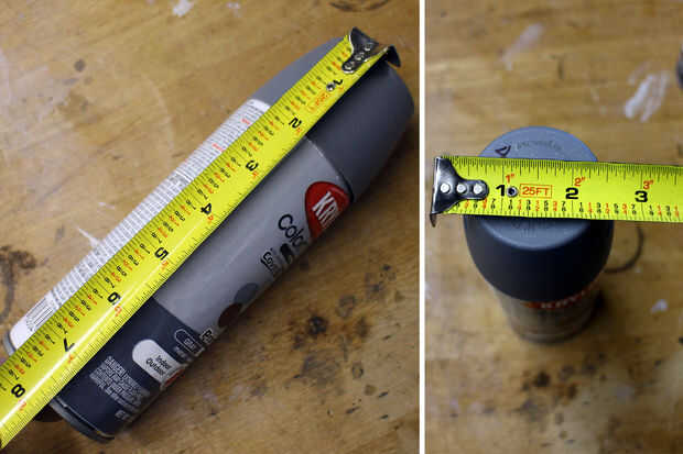 Empecé por una lata de pintura en aerosol con la tapa de medición en. Me di cuenta de que algunas latas de aerosol son ligeramente más largos que otros, pero casi todos fueron estandardizados en 8" de alto y 2 5/8" (203 mm x 67 mm).