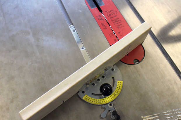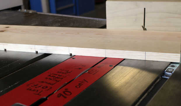 Antes de que puedo cortar las mortajas que los estantes se deslizarán, necesito medir el espesor de la hoja de Sierra de mesa para saber cuánto material se eliminará (esto se conoce como la hoja de corte). El corte de la mesa de la Sierra es 1/8 o 0.125"(3.2 mm), los estantes que estoy usando son 3/16" o 0,1875"(4.8 mm). por lo tanto, tendrá que hacer dos pasadas por cada estante asegurar que el estante caben en la ranura.