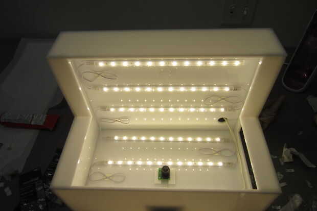 5. cadena de la energía a través del orificio en la parte posterior de la caja y colocar todas las tiras con los accesorios incluidos. Instalar los LEDs en las líneas punteadas rojas. El conectado al cable de alimentación va en el frente de la base y el resto ir hasta la parte posterior. Sólo utilicé dos pedacitos de cinta de doble palo por tira para conectar las luces. La primera de ellas traslapará con lo de cable de la cámara. Asegúrese de que todo funciona! También puede cinta abajo los accesorios de alambre para que se vea más bonito.