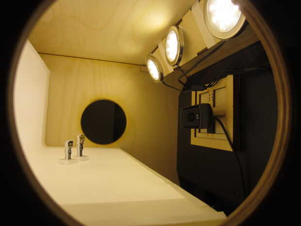 8. Arme el montaje de la cámara como se muestra usando pegamento de algunos elmer. Fue diseñado originalmente para 2 cámaras, pero sólo necesitas uno, por lo que puede pasar por alto el segundo conjunto de agujeros.