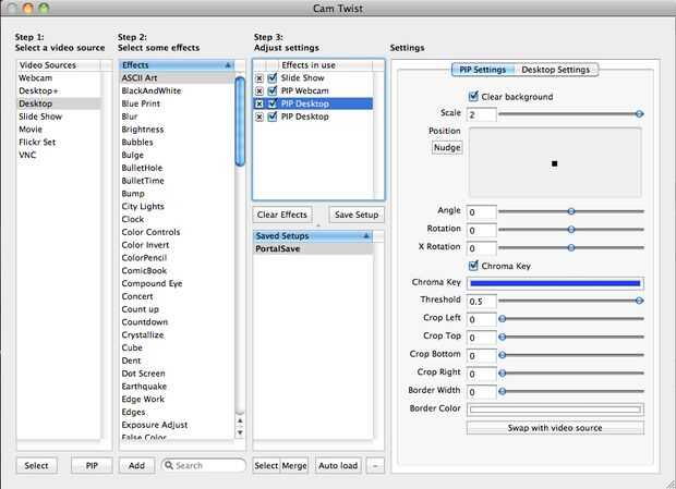 10. en la configuración de la PIP, marque la casilla "Fondo transparente". Arrastre el regulador escala hacia la derecha. Compruebe la clave de croma. Umbral de arrastrar hacia la derecha. Y con el selector de color de Chroma Key Seleccione el fondo azul. La imagen de la webcam ahora debe superponerse con la animación de la aplicación flash.