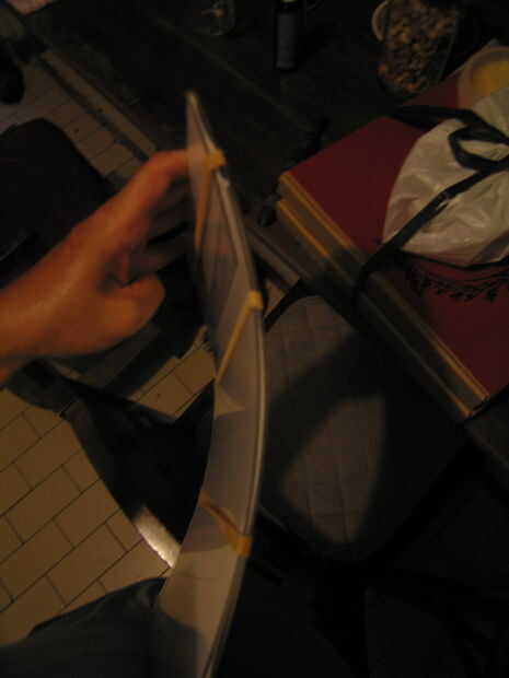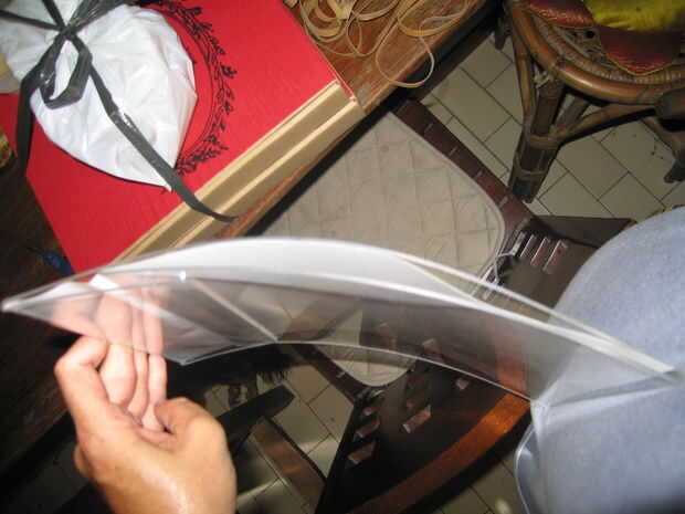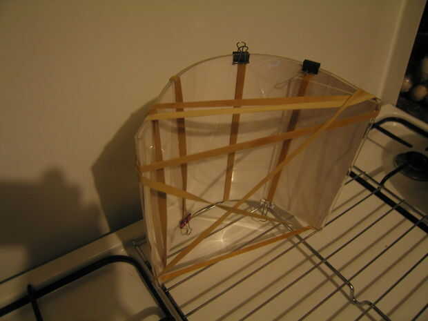 Las dos capas de acrílico podrían empezar a separar al deformarlos, encajado en unos goma para mantenerlos juntos. Incluso recorta algunos sujetapapeles de primavera en la goma por lo que es mejor (sólo en el caucho, no directamente en el acrílico).