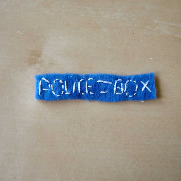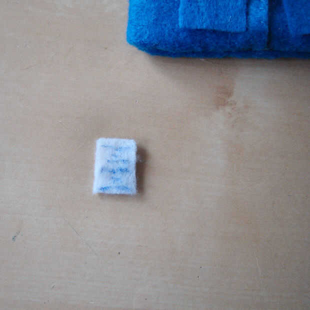 Cosido a las letras para el cartel de la caja de policía con hilo de bordar.  El cartel de la puerta apenas garabateadas en la pequeña plaza de fieltro blanco con un rotulador azul.