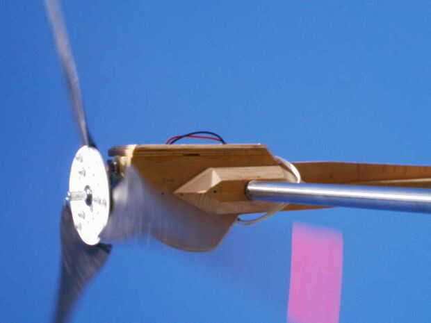 Otra manera de "reactivar" las cuchillas, si montado en un mástil inusualmente alto, es simplemente ejecutar el poder de paquete de batería a través del "generador" para que uno o dos segundos, para que las cosas en movimiento. Una larga cadena de 24 pulgadas se ha adjuntado a la parte posterior de la inferior de la aleta de la cola, para servir como un simple testigo: 90 grados no = viento; 45 grados = velocidades cuchilla sostenible; 30 grados a 0 grados (paralelos al suelo) = velocidades de carga de batería.