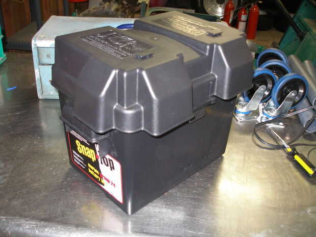 De plástico caja suficientemente grande para que la batería, cables y taller al menos unas pulgadas. Utilicé una caja de plástico de la batería Marina, sobre $6 de W - mart. Estos se utilizan en barcos y vehículos recreativos por lo que las baterías se pueden mover. Plástico cajas de herramientas, cubo de 5 galones, algo plástico y grandes que suficiente puede trabajar.