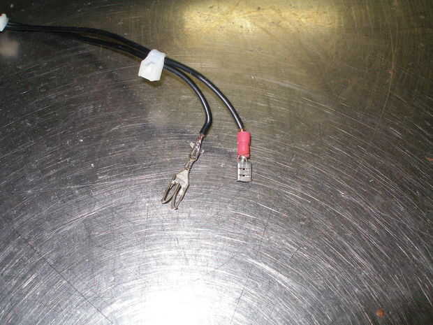 Encontrar terminales que ajusta las cuchillas en un tomacorriente eléctrico y soldarlos a unos 12" longitudes de 10ga cable de cobre trenzado. Tenía dos terminales diferentes, pero que se conectan tanto OK. Rojo y negro le ayudará a mantener las cosas en orden, pero sólo tenía negro. El otro extremo de cada alambre conseguir un terminal de la batería, clip de piel de cocodrilo, o sólo unos 3/4 de pulgada del aislamiento de la tira y deja por ahora. Cable de atados los dos cables en un par de lugares para ayudar a evitar que se enrede.
