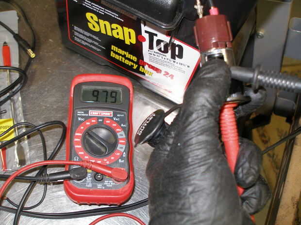Conecte los terminales sobre las cuchillas de la toma de corriente y fije los extremos opuestos a los terminales de la batería. Terminal de la batería Conecte al centro de la toma de corriente positivo, negativo se conecta a coller exterior. Con el multímetro, se prueba la polaridad. Ponga el multímetro en voltaje DC. Coloque la punta de prueba (rojo) positivo al terminal del centro dentro de la salida y la sonda (negro) negativo en el anillo exterior. Una lectura positiva significa que les esté conectado correctamente. Si usted consigue una lectura negativa, invertir los terminales en la toma de corriente. Marcarlos para que pueda ser reconectados correctamente más adelante. Puedes ver que mi batería está baja, pero leyendo la polaridad correcta, así está buenos para ir. Además, puedes ver que yo no uso una batería de terminal; Sólo sujeta los cables pelados a los bornes de la batería con abrazaderas para manguera. A solucionarlo más adelante. ;)