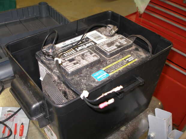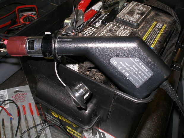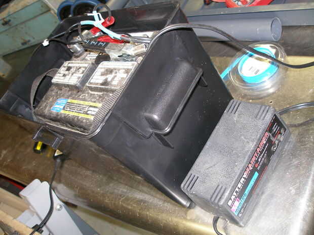 Ahora que está conectado el adaptador, tenemos que conectar el cargador simplemente apriete la pinza roja del cargador al polo positivo, negro al terminal negativo de la batería. Este cargador es lo suficientemente pequeño como para caber en la caja de la batería, pero esto no parece demasiado seguro. Hay un montón de espacio para montar el cargador fuera de la caja.