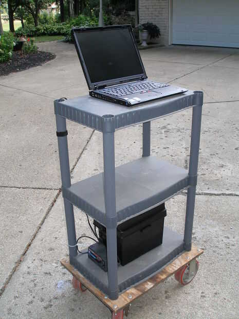 Dependiendo de lo que ya tiene, esto se puede construir económicamente. Mi costo total fue de $75, incluyendo el Bloc de notas! Ya tenía el estante, cargador, batería, etc.. El equipo y una nueva batería serían los elementos de costo más alto, pero una batería considerada inútil para un tractor o un coche puede funcionar bien para un notebook, por lo que se puede encontrar baratos. Ruedas pueden resultar caras, pero su tienda de la herramienta de importación locales puede tener un carro barato muebles, o una carretilla de mano $20 que podría ser adaptada.