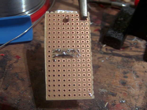 Voltee la placa y soldar los condensadores. doble el pasador más cercano del regulador hacia las clavijas exteriores y soldarlos juntos.