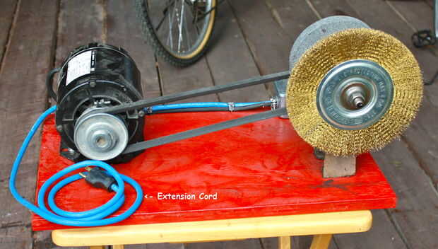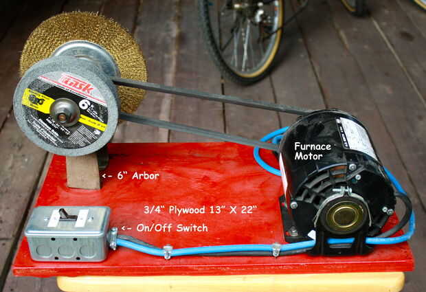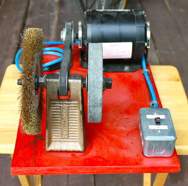 Con el motor y el eje unido a la madera contrachapada es el momento para conectar el motor. Tomar el cable de extensión y retire el extremo hembra. Usted puede atar con alambre esto directamente al motor por lo que cuando se conecta en el molino arranca. Elegir agregar un interruptor de encendido/apagado. Tomé una caja eléctrica cerrada y funcionó los cables del motor a la caja eléctrica. Luego tomó el cable de extensión y funcionó a la caja eléctrica y había instalado un interruptor de luz normal y una placa de interruptor. Poner en tus muelas, en mi caso un esmeril y una rueda de alambre.
