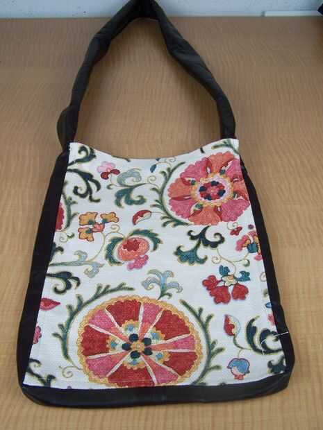 Cortar dos rectángulos de tela estampada 1" más grande, todo, que quiere la bolsa terminada. Cortar la venda o el boxeo para el bolso de ropa de cuero reciclado. Coser la parte delantera de la bolsa para boxeo. Después de coser el bolsillo en la parte posterior, coser la parte posterior del bolso a otro borde de boxeo de cuero.