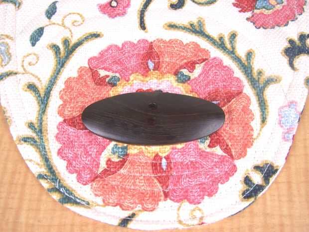 Después de hilvanar 1/4" todo alrededor de la parte superior del bolso, guarnición de cogida y en costura, handsew botón gigante en medio de aleta para peso presionando la aleta de la aleta.