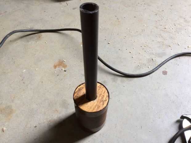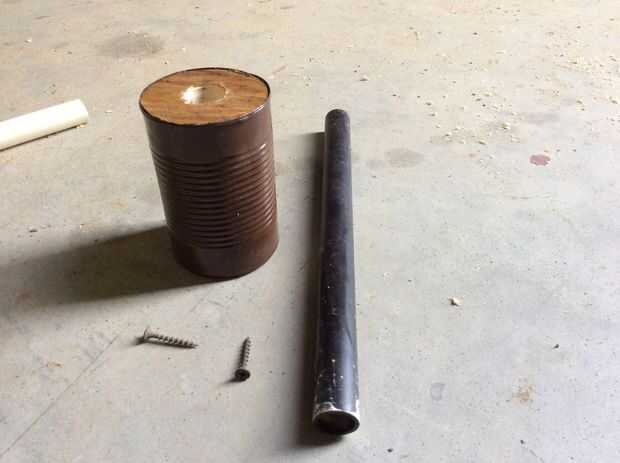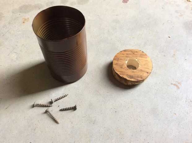 Tomar su seco puede y la masilla en la pieza no manchada de madera en el poder como tal. Luego tomar la segunda pieza de madera teñida y colocar en la parte superior para que la parte manchada hacia fuera y está apenas por encima de su poder del borde. Tornillo 2 tornillos en el borde de su poder a través de la madera. Asegúrese de no tener un tornillo de ir hasta el agujero en el centro. Introduzca el tubo como se muestra arriba y contemplar con asombro a su creación... ¿Hecho todavía?