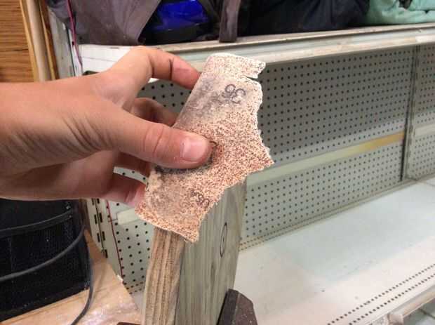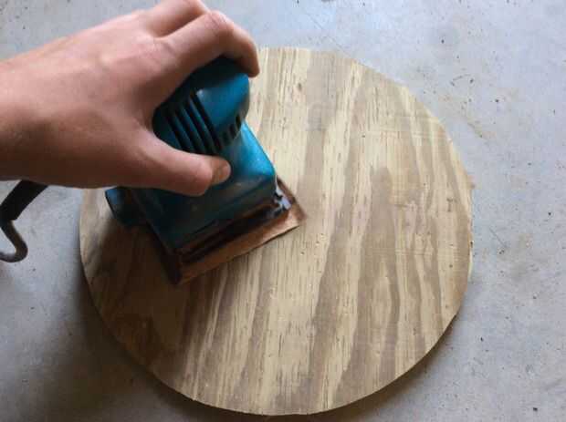 En este paso de la arena el pedazo entero círculo en forma de madera. Asegúrese de lijar con el grano - la forma de que las líneas de madera ir. Debe utilizar varios granos de lija, recuerda ir de granos como de 80 a 100 a 150 grano. Lije los bordes del círculo para que cuando se miran son redondos como el mío.