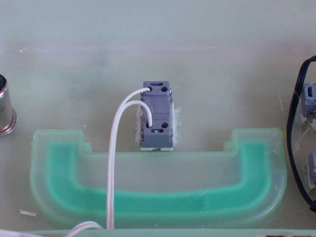 1.) usar un soldador para derretir el plástico o simplemente use una dremel para moler el plástico. Luego pegue el interruptor. 2.) Conecte un cable al interruptor.