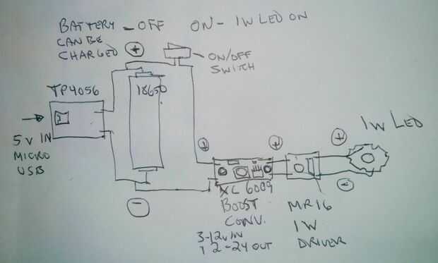 Resumen - a los blancos de 1w led de alimentación usé un conductor mr16 led para entregar la corriente constante de 350mA. 12V se necesita para ejecutar la mr16 usé un XL6009 3-12v en a 12-24v salida convertidor a 3.7v de 18650 a los 12v necesitada. Por último un módulo de tp4056 fue unido directamente a la batería para permitir la carga mediante un cable micro usb. Usé el bosquejo arriba a trabajar. Si encuentras mi explicación bastante no lo hace por ti tal vez el bosquejo puede ser más fácil de entender.